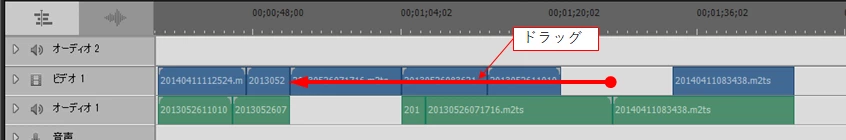 ビデオクリップをドラッグで移動した場合は、オーディオクリップが切断され、切断された後半部以降がビデオクリップと同じ時間右にずれる。元のビデオクリップの部分は空白になる。