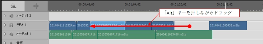 ビデオクリップを「Alt」キーを押したままドラッグで移動した場合は、オーディオクリップはそのまま。元のビデオクリップの部分は空白になる。