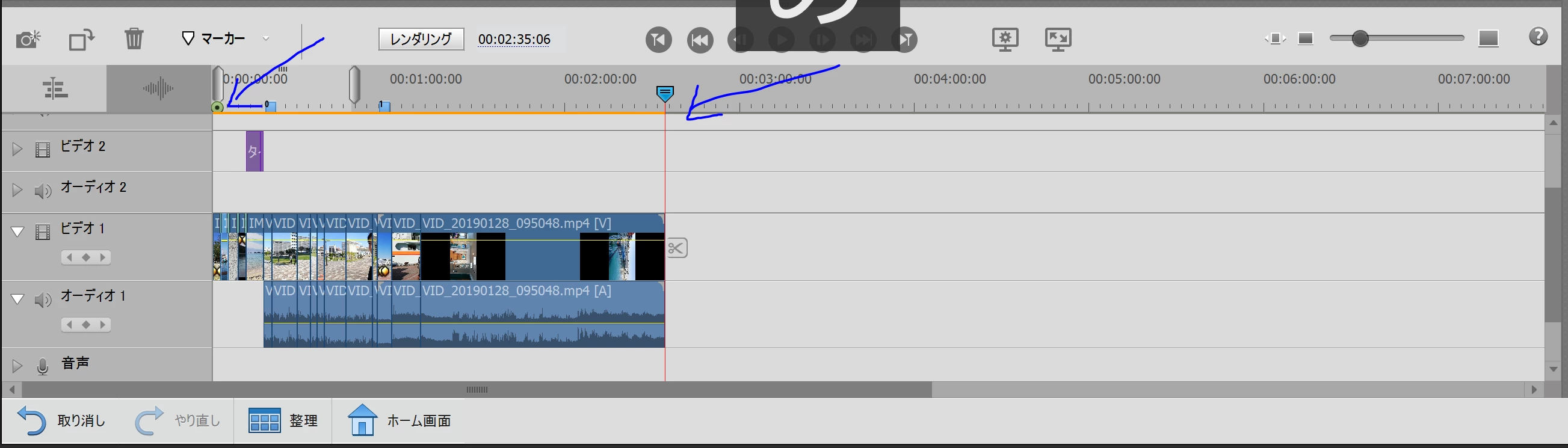 Premiere Elements2019でタイムライン上で最初と最後に一気に移動できるショートカットありませんか?(下記矢印のところ)