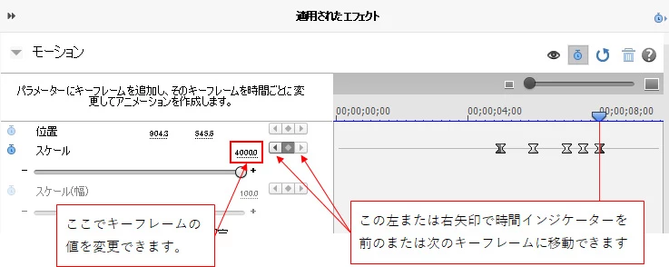 下図を見て頂いて、「左」または「右」矢印をクリックすると、時間インジケーターが「前」または「次」のキーフレームに移動します。この矢印のクリック操作で、時間インジケーターを対象のキーフレームに移動します。