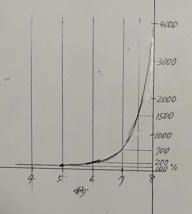 参考ですが、拡大率は、私は下図のようなグラフを作成して求めました。最初はリニアでの入力になりますのでカクカクですが、次にすべてのキーフレームを選択してベジェに変更すると、滑らかな曲線になると思います。