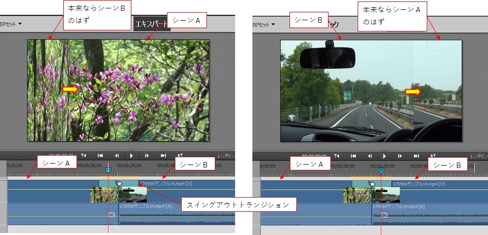 ちょうど、タイムラインのシーンAとシーンBの継ぎ目のタイミングでそうなります。