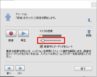 音声が割れるようでしたら、下図赤枠部のスライダーを左へ振って調整してみてください。