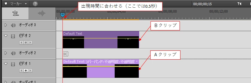 ・タイムラインで、時間インジケーターをタイトル文字を出現させる時間に合わせます。ここでは0.5秒ですが、実際には動画を見ながら決めると良いと思います。