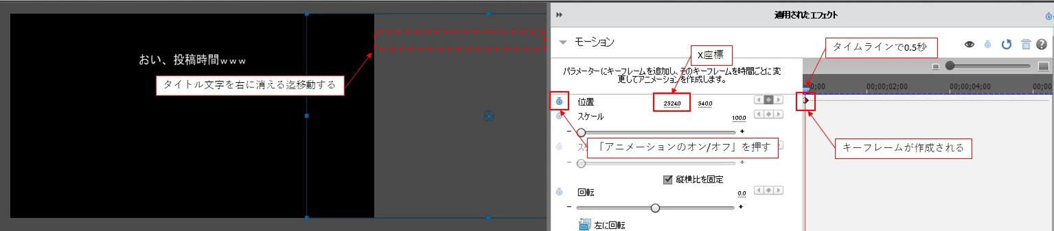 ・「モーション」の「位置」の「X座標」の数値を、タイトル文字が右に消える迄、大きくします。