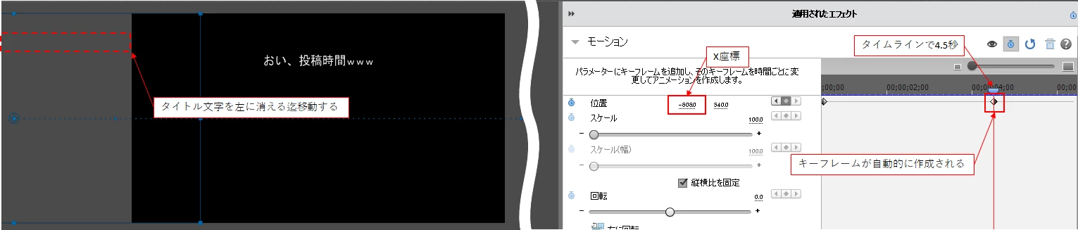 ・時間インジケーターをタイトル文字が左に消える時間(ここでは4.5秒)に合わせます。