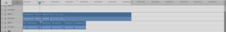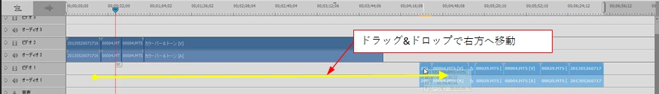 ④上記②で右方へ移動した全クリップを選択し、ドラッグ&ドロップで「ビデオ 2・オーディオ 2」トラックへ移動します。