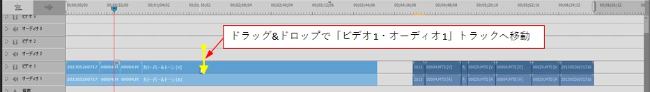 ③「ビデオ 2・オーディオ 2」トラックの全クリップを選択し、ドラッグ&ドロップで「ビデオ 1・オーディオ 1」トラックへ移動します。