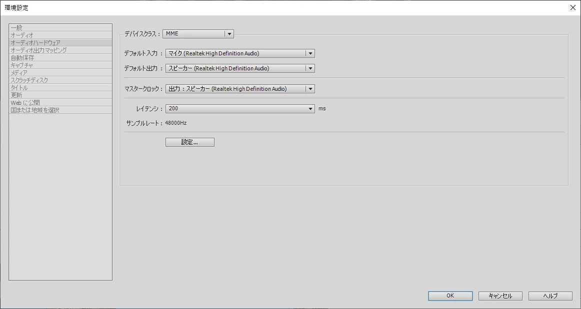 ①「環境設定」の「オーディオハードウェア」が下図のようになっているか確認してみてください。