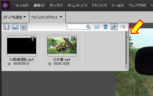 ①「プロジェクトのアセット」パネルの右辺にカーソルをおき、双方向矢印に変わったら右へドラッグします(上図黄矢印部)。