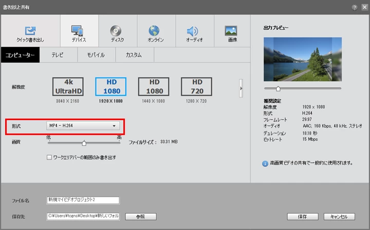 ただし、Premiere Elements 2019で編集した結果を、.mp4ファイル形式で出力すれば(下図赤枠部)、Premiere Elements 2018で読み込むことが出来ますが、タイムラインには1個のクリップとして配置され、その1個のクリップに対して編集は出来ますが、クリップが統合されているため自由な編集が出来なくなります。