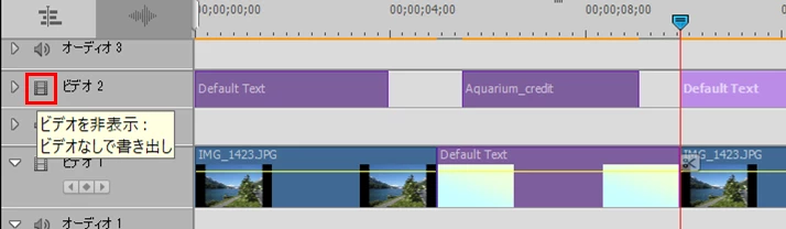 もしタイトルが邪魔なら、2019でタイトルクリップ全てを、あるビデオトラックに移し、そのトラックのヘッダー部の「ビデオを非表示」アイコン(下図赤枠部)をクリックしトラック出力をオフにして.mp4ファイル形式で出力する方法もあります。この場合は2018でタイトルを入れます。