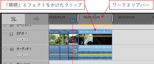 ①対象のクリップに「照明」エフェクトをかけ、そのクリップに「ワークエリアバー」を設定します。両脇の縦棒をドラッグして、ワークエリアバーの範囲を調整します。