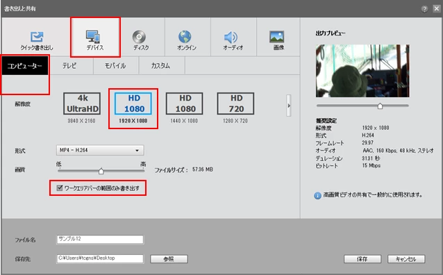 この時、解像度はプロジェクト設定の解像度に合わせてください。さらに、「ワークエリアバーの範囲のみ書き出す」に必ずチェックを入れてください。