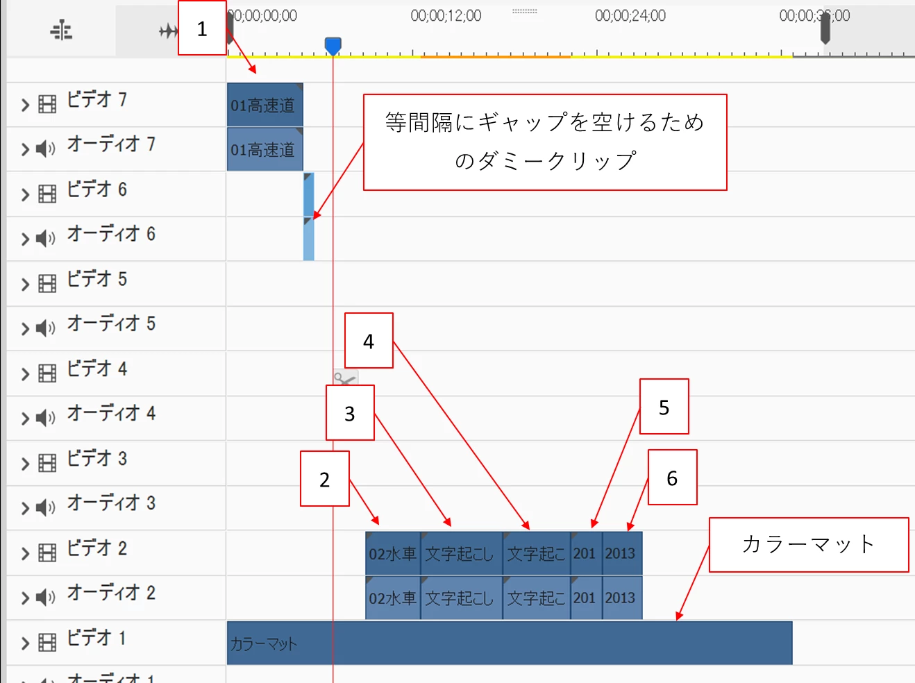 もし、クリップとクリップ間のギャップを等間隔にする場合は、例えば20フレーム長さのダミークリップをビデオ6&オーディオ6トラックに配置します。