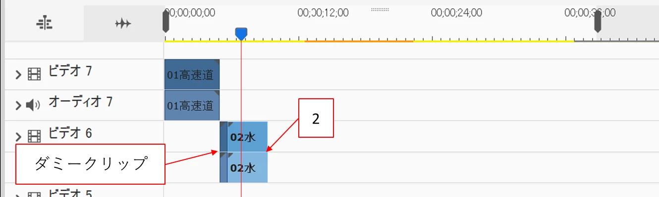 ②映像2クリップをダミークリップの右側に配置します。