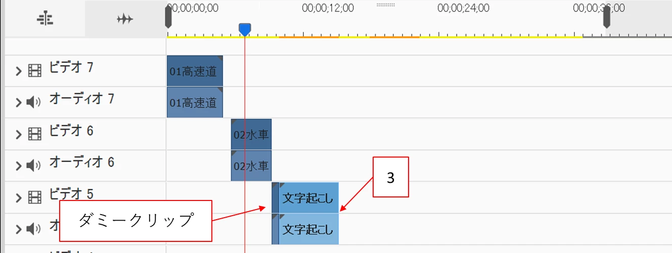 ③ダミークリップをビデオ5&オーディオ5トラックに移動し、続いて映像3クリップも同様に配置します。