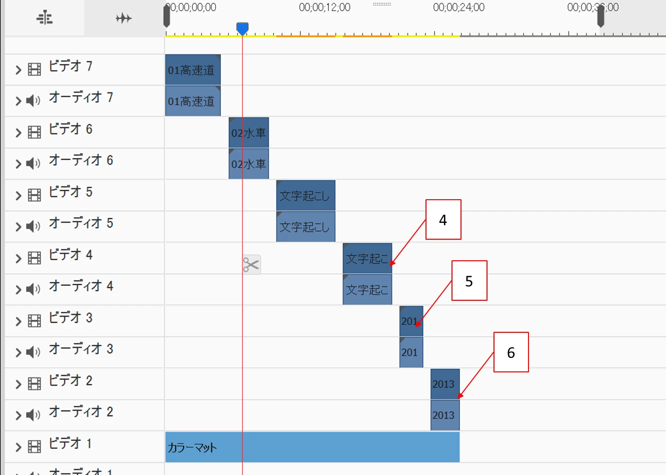 カラーマットは長さを映像6クリップの右端に合わせます。