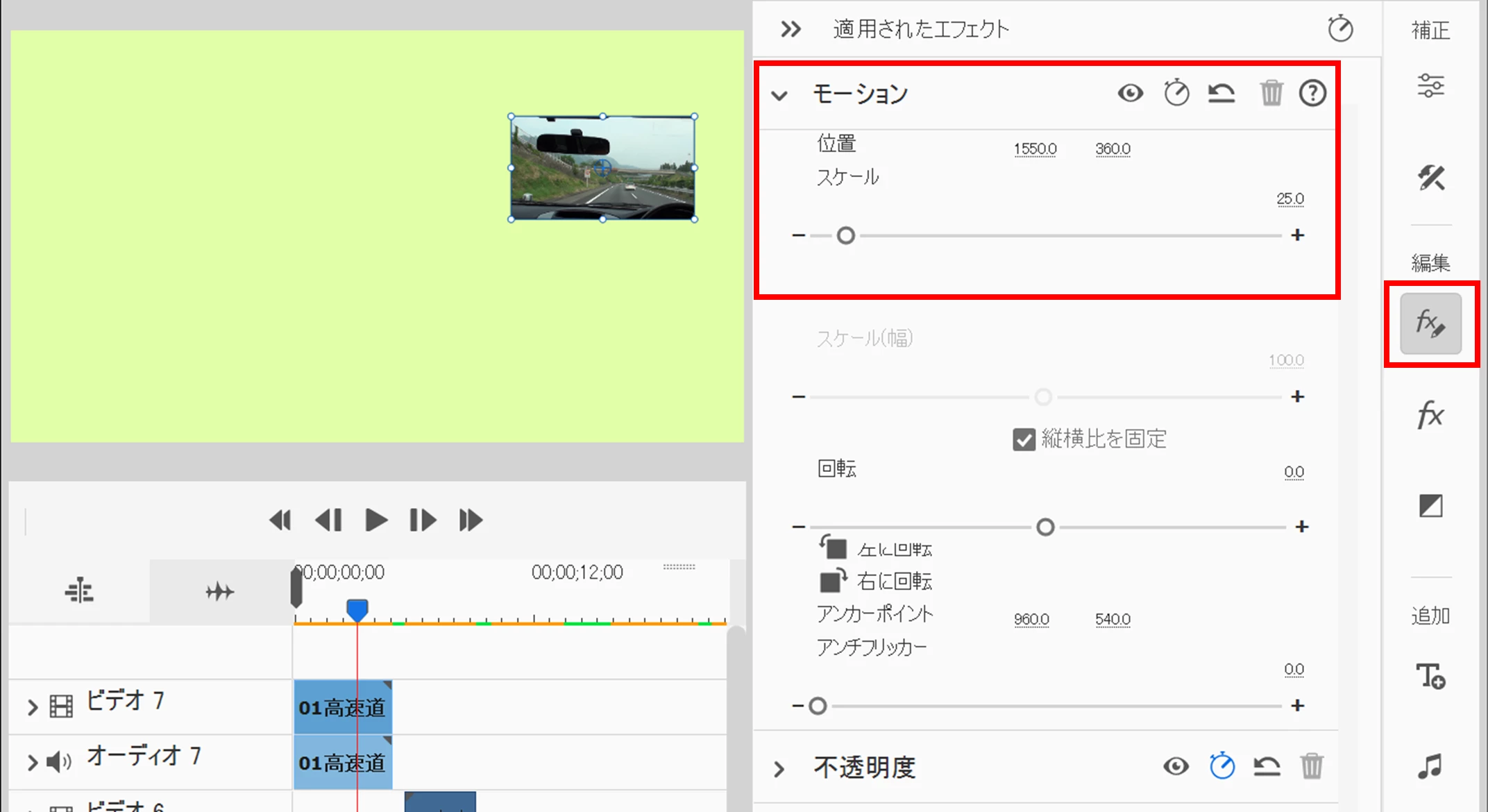 映像1クリップを選択し、「ツールバー」の「fx+鉛筆」アイコンをクリックし、開いた「適用されたエフェクト」で「モーション」の「位置」と「スケール」で映像1の位置とサイズを調整します。