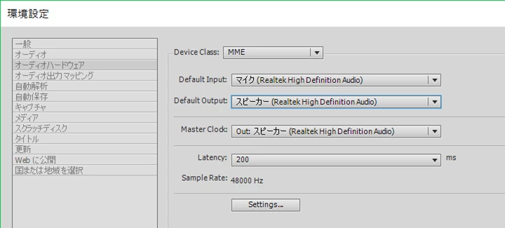 メニューの「編集」→「環境設定」→「オーディオハードウェア」を選択し、開いた「環境設定」ウィンドウの設定内容を下図と照らし合わせてみてください。下図はWindows 10、Premiere Elements 2018、ノートPCの場合です。