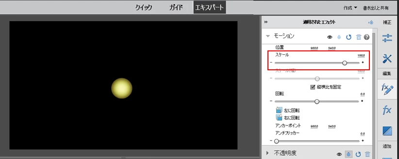 「適用されたエフェクト」パネルで、「モーション」の「スケール」パラメーターで全体的に拡大出来ます。