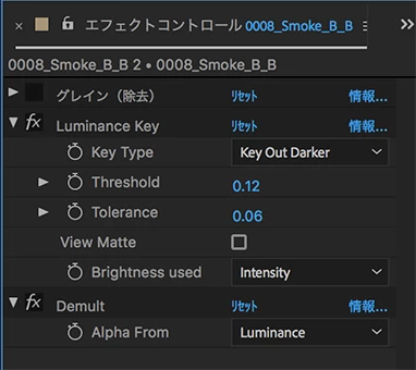 蛍の映像のビデオトラックの上側のビデオトラックに光のタイトルクリップを乗せ、「モーション」の「位置」、「スケール」、「不透明度」の各パラメーターにキーフレームを打って追尾させるというものです。