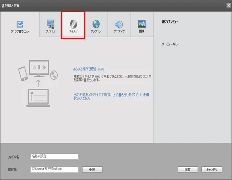 ④開いた「書き出しと共有」ウィンドウで「ディスク」をクリックします。