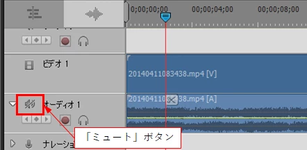 ②オーディオトラック左端部の「ミュート」ボタン(下図赤枠部)が押されていませんか。押されている場合は、ボタンに斜めの線が入っています。