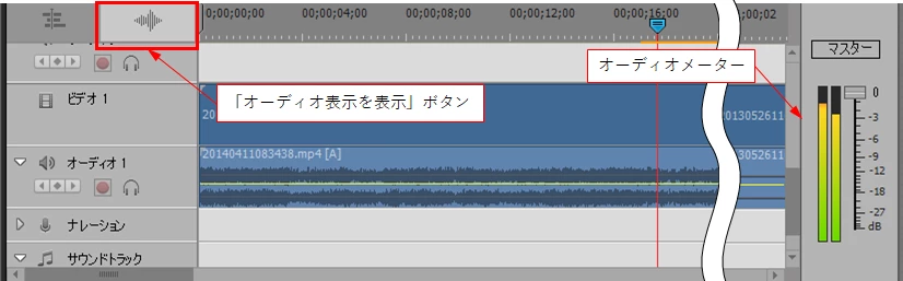 「オーディオ表示を表示」ボタン(下図赤枠部)をクリックして、「オーディオメーター」を表示します。再生してオーディオメーターが振れるか確認します。振れていれば、音声は出るはずですが。