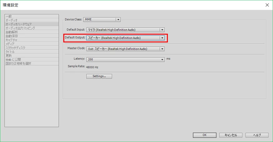 メニューの「編集」→「環境設定」→「オーディオハードウェア」を選択し、開いた「環境設定」ウィンドウの「Default Output」項が「スピーカー」以外に設定してあったら「スピーカー」に設定変更し、「OK」をクリックします。