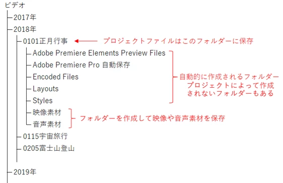 下図は「ビデオ」フォルダーの年月日を証にしたフォルダー作成方法の一例です。参考にしてください。