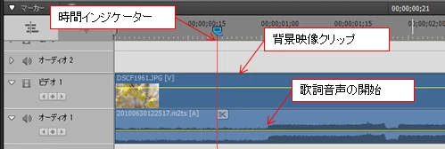 ❶ 時間インジケーターを歌詞「山」の「ま~」の伸ばし開始時間に移動します。多少ずれていてもOKです。