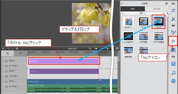 ①「ツールバー」の「fx」アイコンをクリックして開いた「エフェクト」パネルで、「ビデオ」→「変形」と選択し、表示された中から「クロップ」アイコンを「ビデオ 3」トラックの「タイトル 02」クリップへドラッグ&ドロップします。