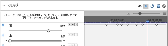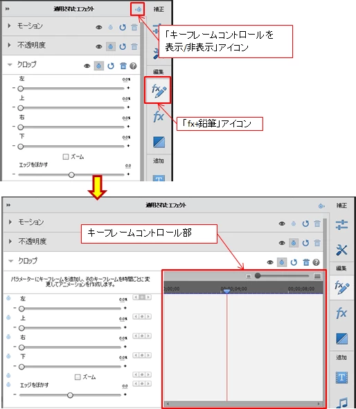 続いて、「キーフレームコントロールを表示/非表示」アイコンをクリックして、キーフレームコントロール部を表示させます。