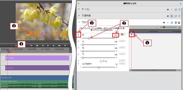 ❷「クロップ」エフェクトの「左」の値を、テロップの緑の色が「追」の文字にかかる直前迄大きくします。