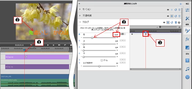 ❷「クロップ」エフェクトの「左」の値を、テロップの緑の色が現れる直前迄大きくします。