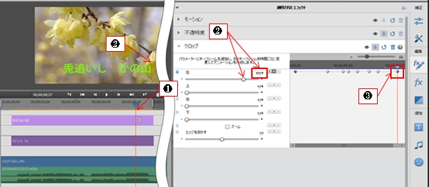 ❷「クロップ」エフェクトの「左」の値を、テロップの緑の色が「山」の文字の上書きが終了する迄大きくします。