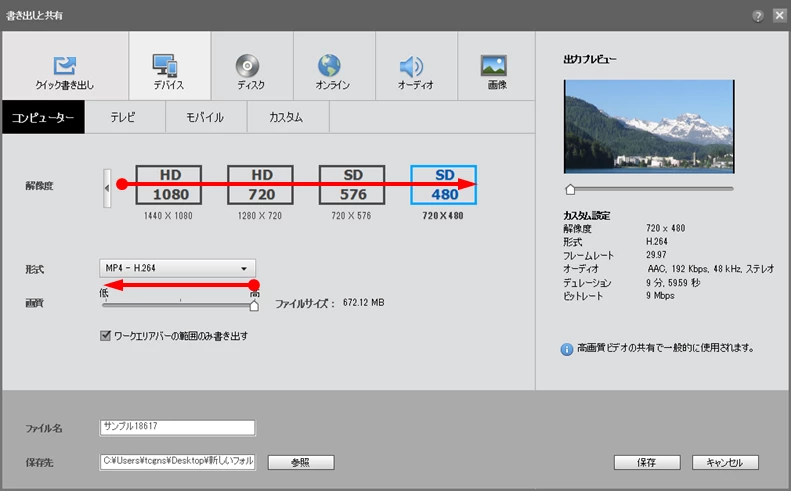 例えば、FHDで撮影した映像を編集し、ファイルサイズを小さくするため解像度「SD480」で書き出すと、がっかりするほど映像品質が低下します。やはりこの場合は、解像度「HD1080(1920×1080)」、画質「中~高」になります。
