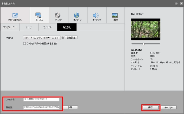 ④前の「書き出しと共有」ウィンドウに戻りますので、ファイル名を入力、保存先を指定して、「保存」をクリックします。