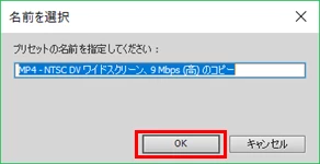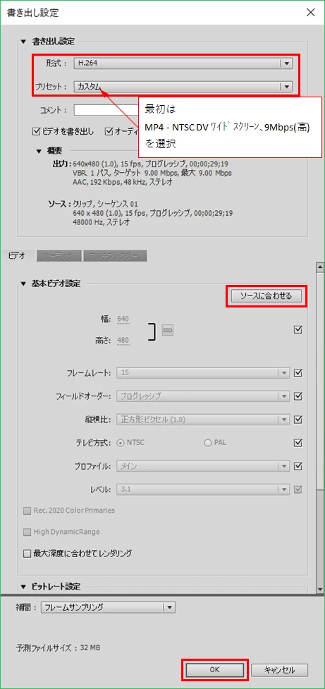 ②開いた「書き出し設定」ウィンドウで、「形式;H.264」、「プリセット;MP4 - NTSC DV ワイドスクリーン、9Mbps(高)」を選択し、「基本ビデオ設定」項で「ソースに合わせる」をクリック、続いて「OK」をクリックします。