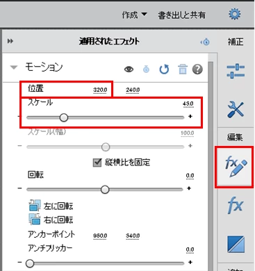 ⑦右端の「ツールバー」から「fx+鉛筆」をクリックし、「適用されたエフェクト」パネルの「スケール」パラメーターを「45.0」に設定します(480/1080≒0.4444⇒0.45)。すると縦方向がぴったり合い、黒帯が消えます。