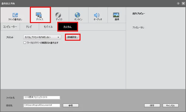 ①「書き出しと共有」をクリックし、開いた「書き出しと共有」ウィンドウで、「デバイス」→「カスタム」を選択し、続いて「詳細設定」をクリックします。