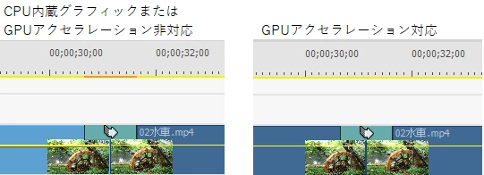 CPU内蔵グラフィックまたはGPUアクセラレーション非対応GPUの場合は、この一連の工程は橙色で表示され、レンダリングが必要であることが分かります。レンダリングをかけると今度は緑色で表示され、再生がスムーズに行われます。