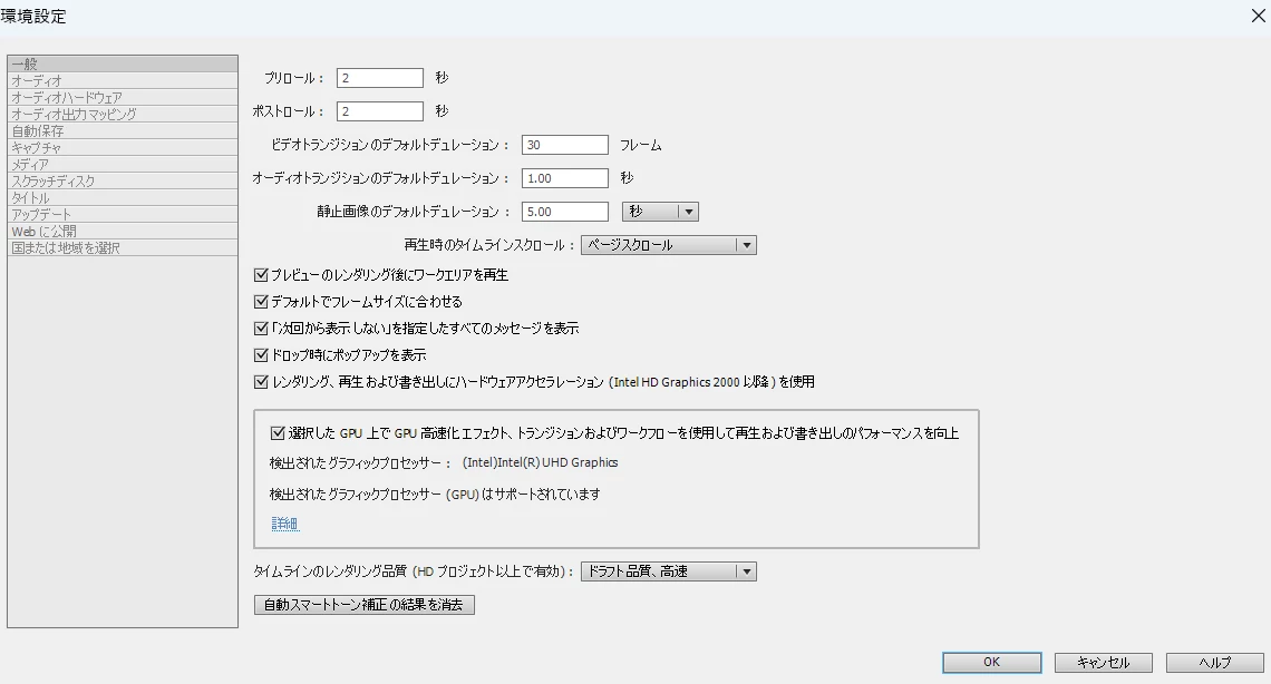 ビデオ1トラックに映像クリップがあり、カット編集くらいではレンダリングバーの色は無色(グレー)か黄色になっています。この場合は、CPU内蔵グラフィックまたはGPUアクセラレーション非対応のGPUでもリアルタイムに再生することができます。