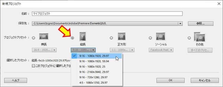 メニューの「ファイル」→「新規」→「プロジェクト」を選択し、開いた「新規プロジェクト」ウィンドウで「縦長」(下図矢印部)を選択し、ドロップダウンメニューを開いて最適な「フレームサイズ」と「フレームレート」の組み合わせを選択します。
