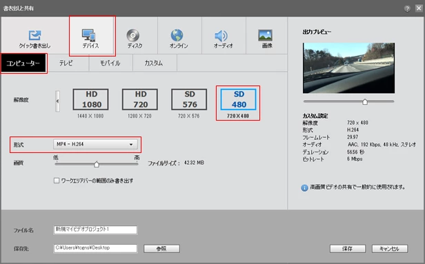 ①「書き出しと共有」ウィンドウで、「デバイス」→「コンピューター」→「SD480」を選択します。