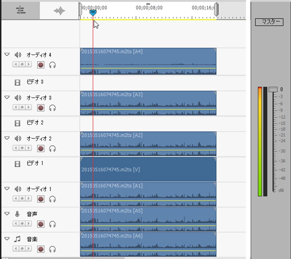 それから、もう一度再現したくてもオーディオが複数行挿入されてしまい、しかもなぜかイヤフォンで聞くと片方からしか音が出てこない状況になっています。映像素材の上でダブルクリックし、開いたウィンドウの再生ボタンをクリックした場合や他の動画再生アプリではちゃんと両方から音が出ています。
