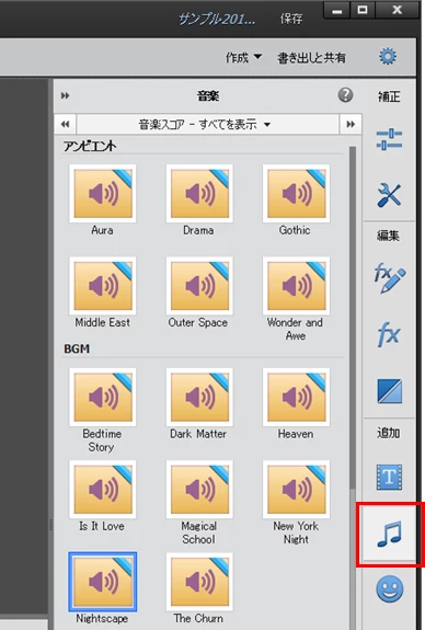 Premiere Elementsマニュアルのビデオクリップへの音楽スコアの追加も確認したのですが、そもそも音楽(サウンドトラックに音楽を追加)