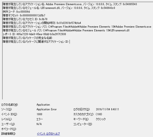 障害が発生しているモジュール パス: C:\Program Files\Adobe\Adobe Premiere Elements 13\UIFramework.dll