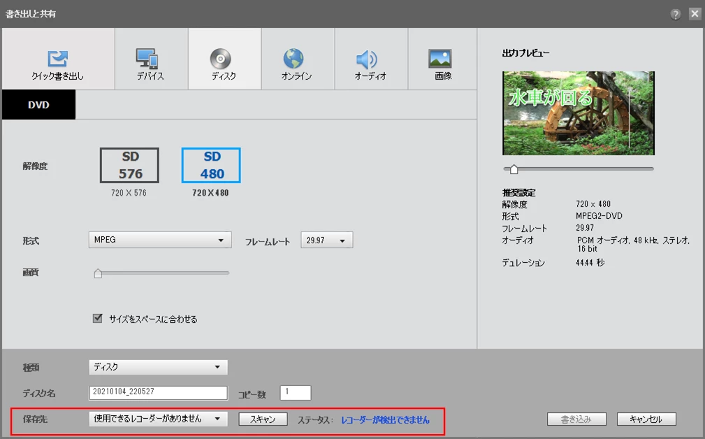 そのため、DVDに書き出そうとしても、レコーダーが検出されないとなってしまいます。